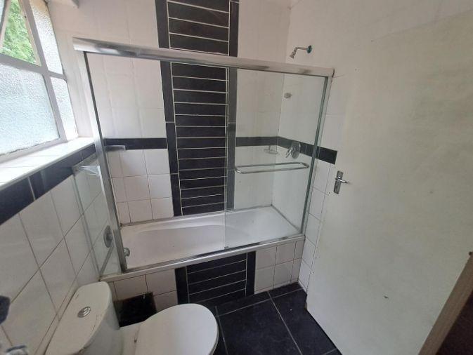 The apartment features a well-proportioned bedroom, a bathroom with shower in bath, and an open-plan living area. The kitchen offers ample cupboard space and room for appliances.