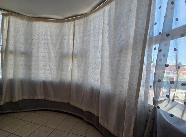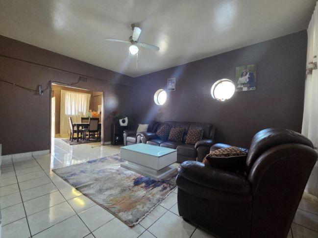 Upon entering, you''re welcomed by a tiled, open-plan living area consisting of a lounge with a ceiling fan and curtains, and a tiled dining room also fitted with curtains.