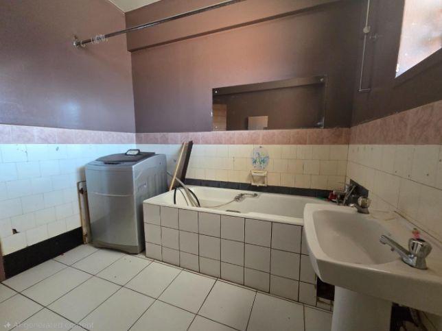 The tiled bathroom includes a bathtub, basin, toilet, and has space for a washing machine.